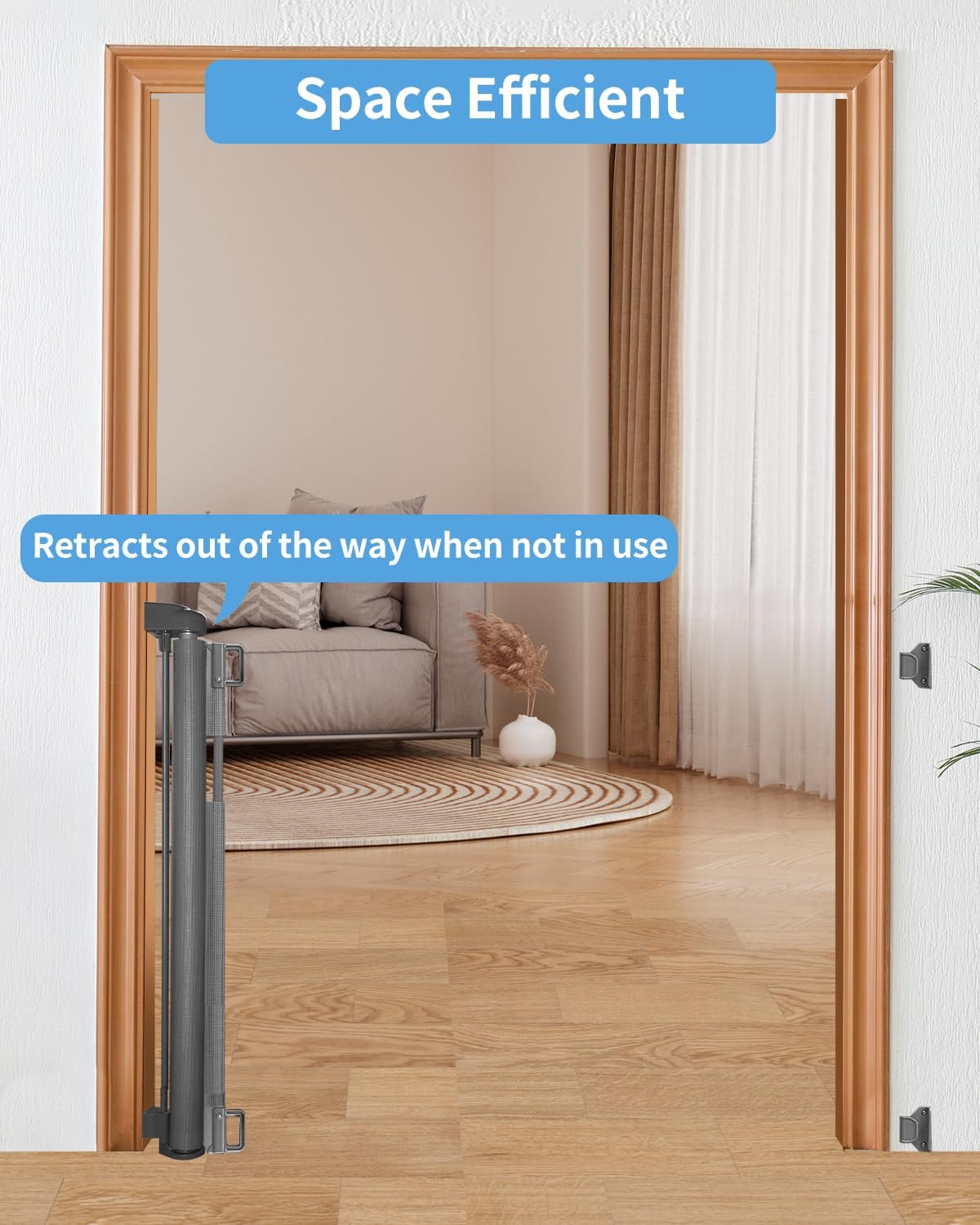 Superior Design for Maximum Coverage:The extra-wide, retractable mesh gate extends up to 55″ wide and stands 33.6″ tall, making it perfect for use in doorways, stairways, hallways, and more. The mesh retracts fully when not in use, saving space. Unlike traditional gates, this design eliminates tripping hazards with no bottom balustrade, making it safe for households with busy parents and pets.