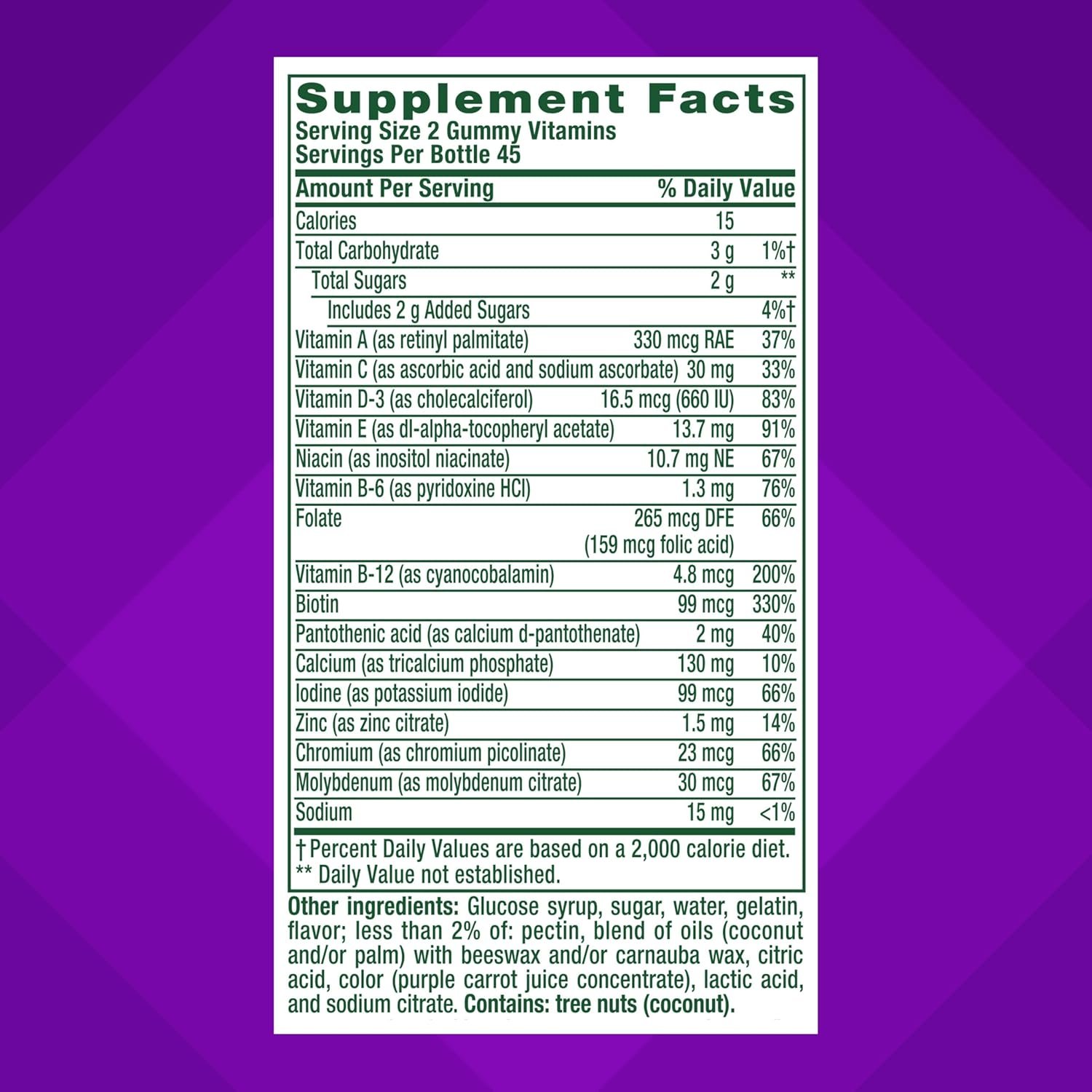 Packed with 15 essential nutrients to nourish your body including Vitamin D3 and Calcium for bone support(1), Vitamins D, C & Zinc for immune support(1), 6 B vitamins to support energy metabolism(1), and Vitamin A to support hair skin & nails(1)