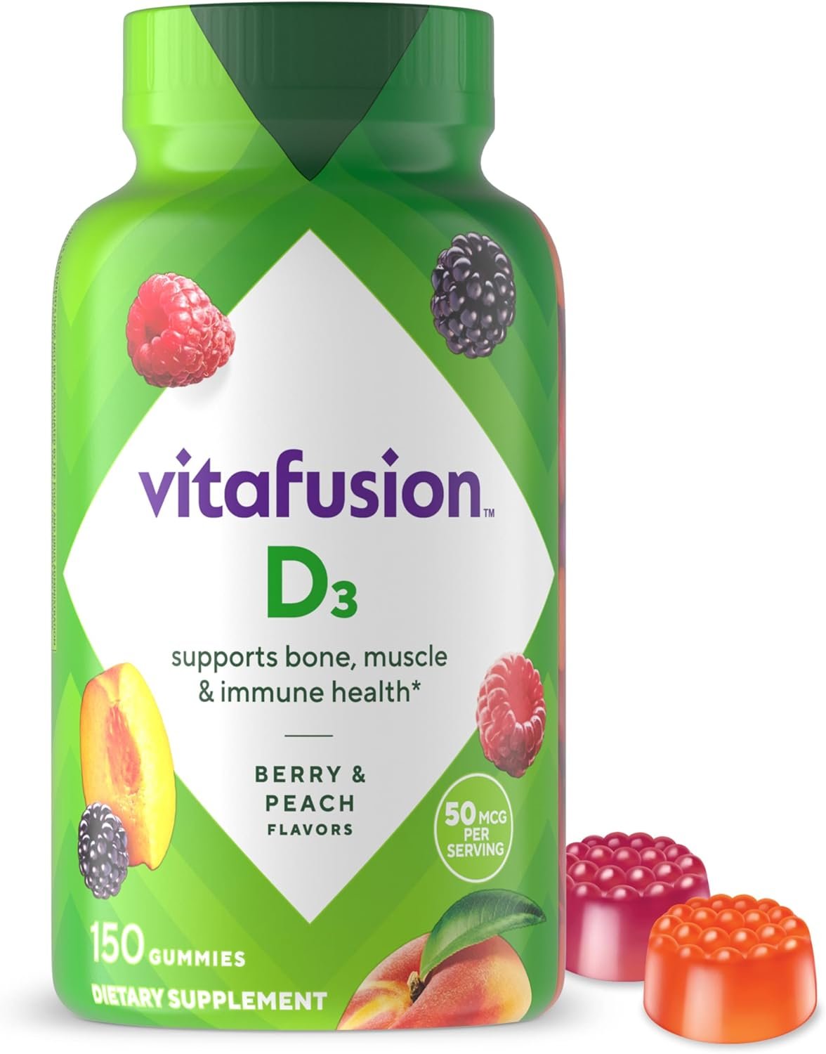 vitafusion Vitamin D3 Gummies, Bone and Immune Support, Peach, Blackberry, Strawberry Flavored, 50 mcg D3 Gummy Vitamin Supplement, 75 Day Supply, 150 Count