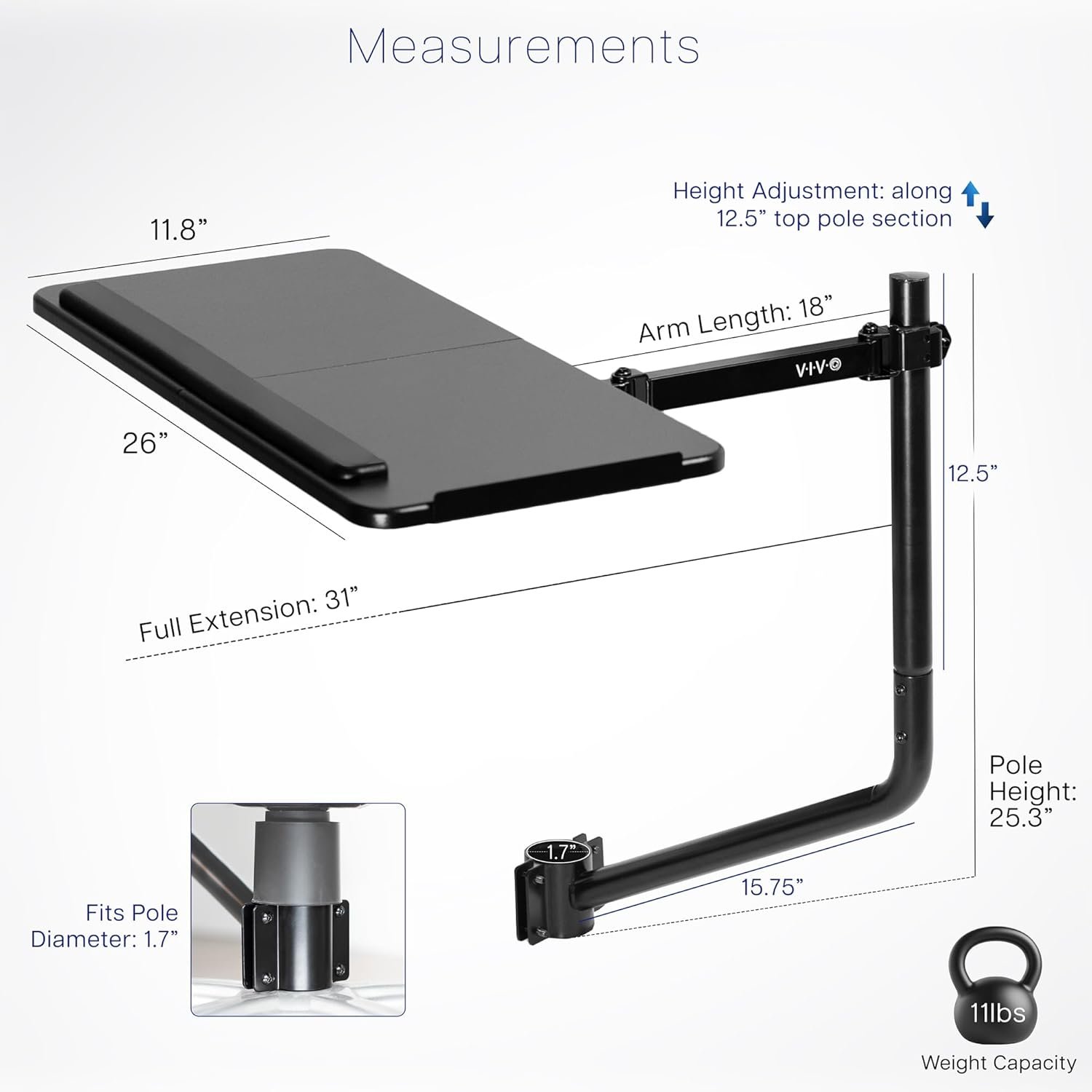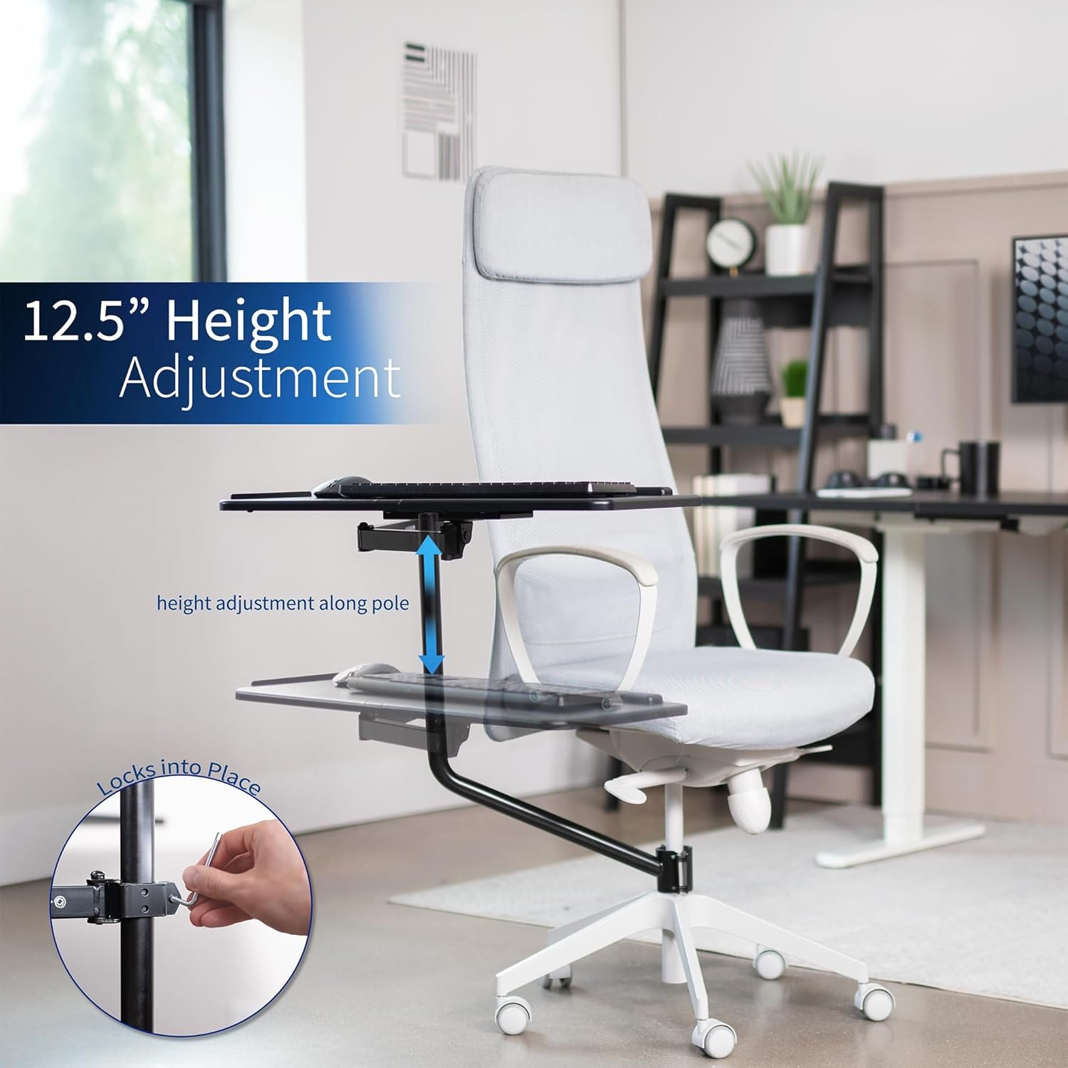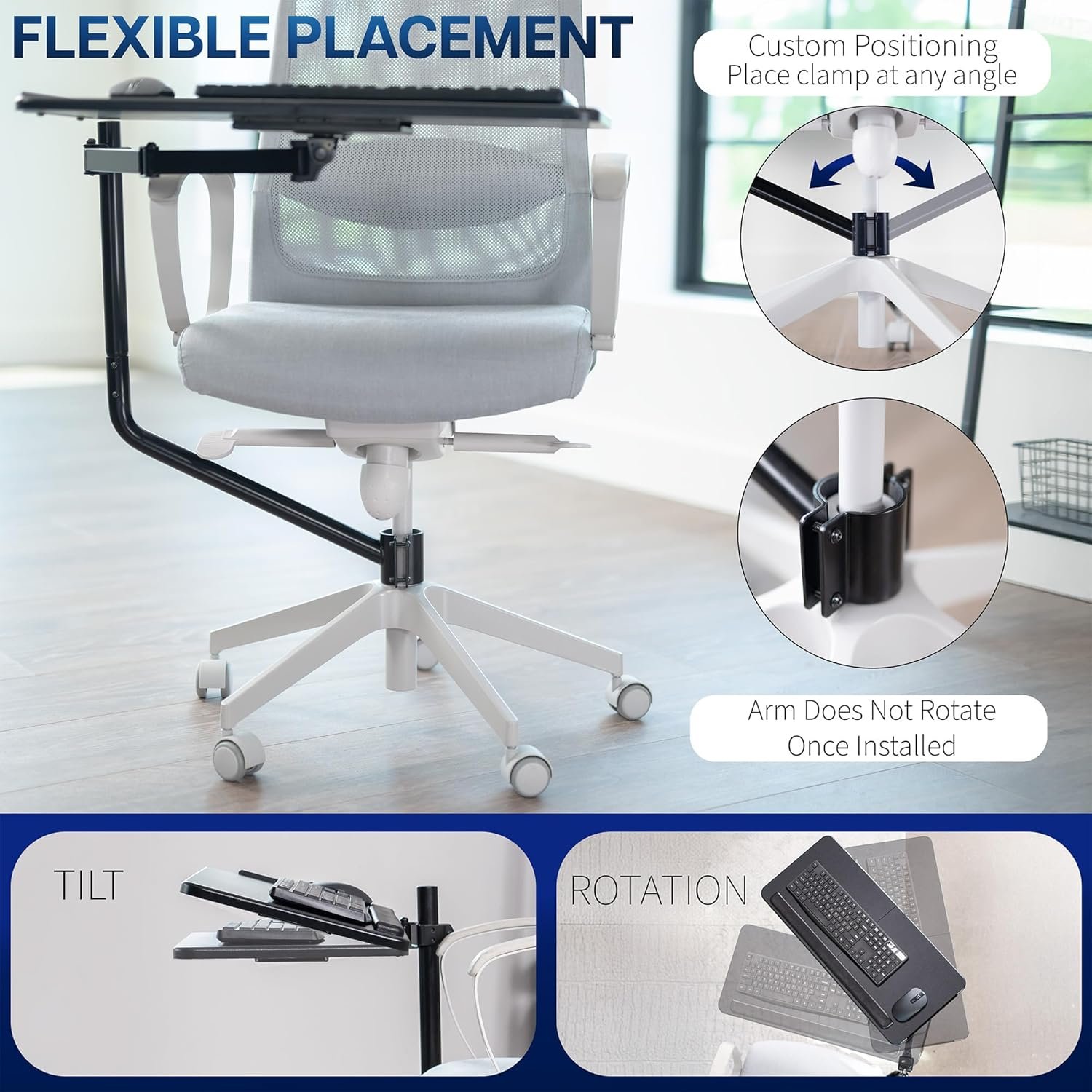 Over Chair Keyboard Tray: Steel arm support attaches to the bottom tube section (1.7” to 2” in diameter) of a standard height adjustable office chair for ergonomic typing angles and customized placement –Patent Pending–