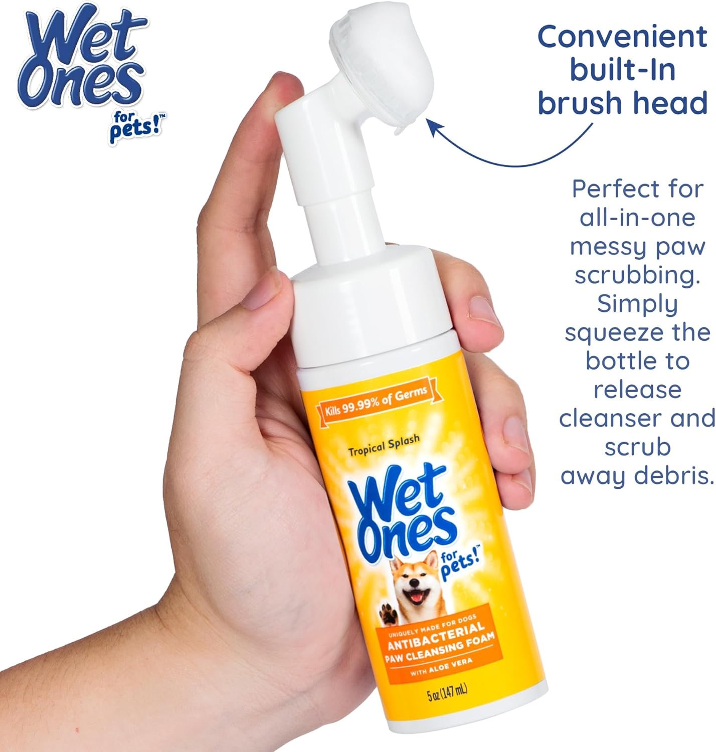 Wet Ones for Pets Antibacterial Dog Paw Cleaner with Built-In Paw Scrubber Brush offers pet parents an easy and effective way to keep their dogs’ paws clean anytime, anywhere. This all-in-one dog paw cleaner uses a foaming cleanser with antibacterial properties, designed specifically for dog paw care. Simply squeeze the bottle to release the antibacterial cleaner into the built-in scrubber, making it a breeze to scrub away dirt, mud, and debris. Your dog’s paws will be left clean and refreshed with a pleasant Tropical Splash scent. This paw cleaner for dogs helps remove dirt from between the toes with its foaming action, making it an essential part of any dog paw care kit. Wet Ones for Pets kills 99.99% of germs, ensuring hygienic dog paw care. The built-in paw washer is perfect for on-the-go dog cleaning supplies. Wet Ones for Pets knows what pet owners need most when it comes to dog cleaning supplies. The easy-to-use design makes this dog paw washer perfect for cleaning up after rainy walks or muddy backyard play. Keep a bottle in your car, at home, or even with your puppy paw scrubber for quick access.