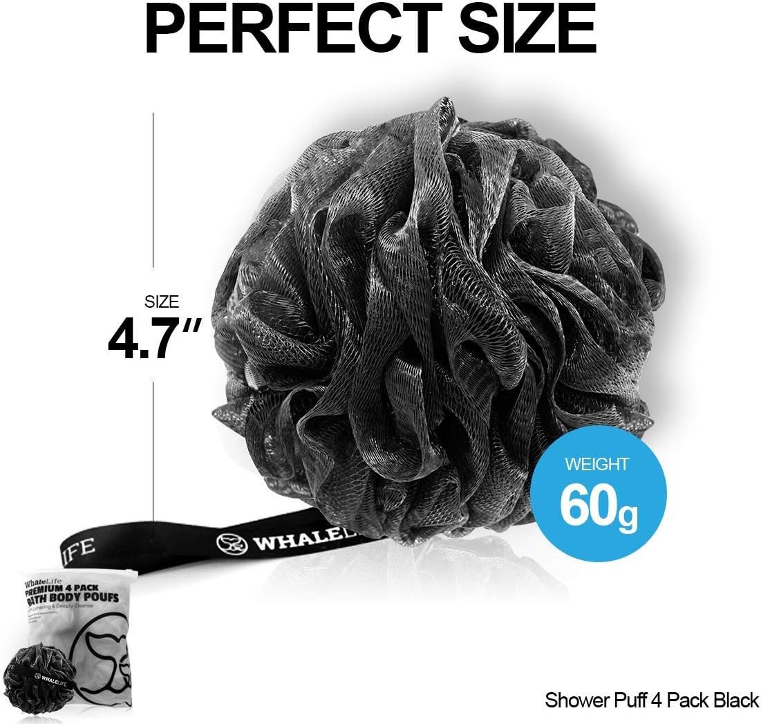 WhaleLife Loofah Bath Sponges – Black Gentle Exfoliating Shower Loofah for Rich Lather, Durable Mesh Body Scrubber for Men & Women 4 Pack