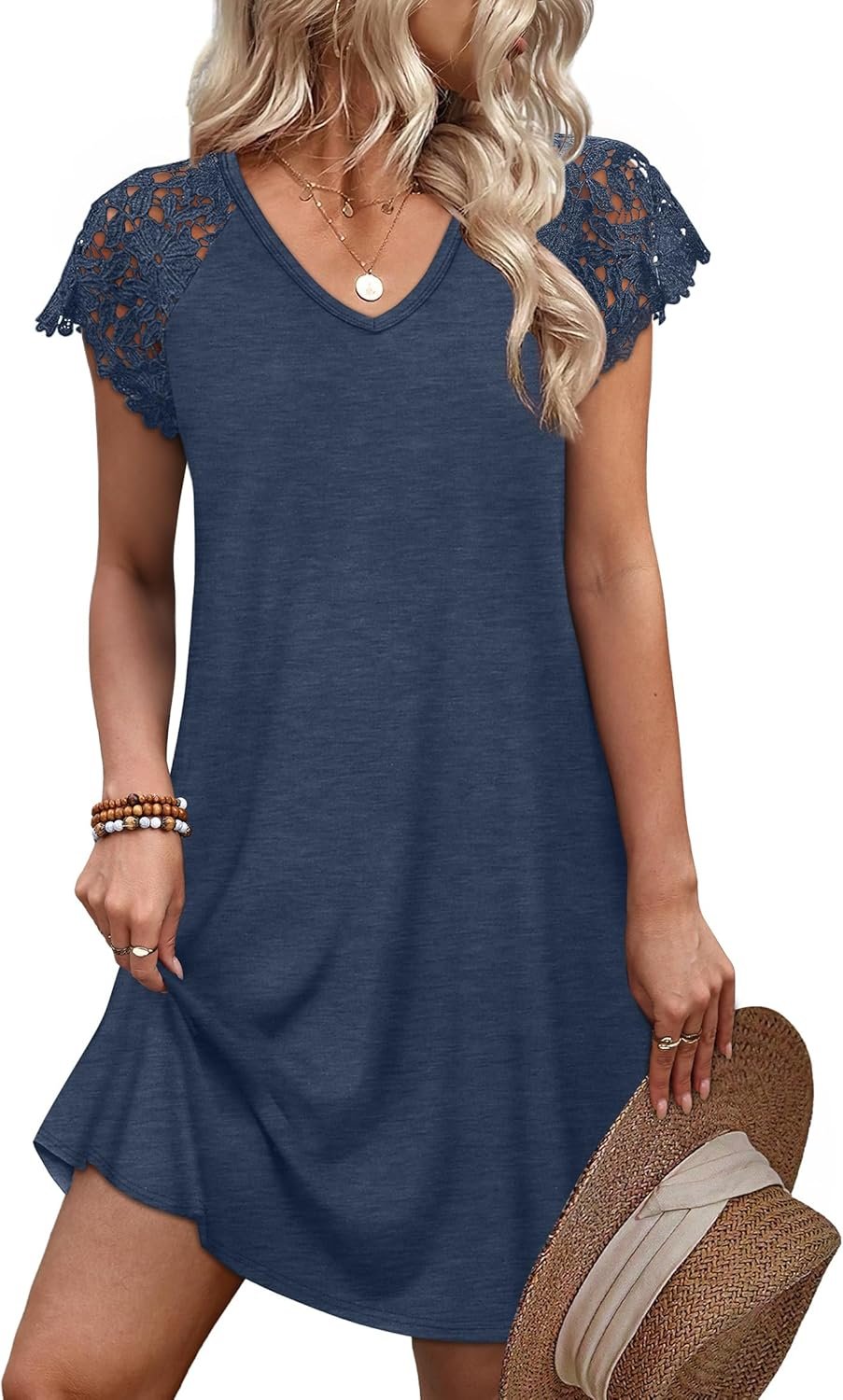 WIHOLL Dresses for Women Summer Casual Wedding Guest Dress Lace Short Sleeve Cute Sundresses Fashion Beach Vacation Clothes