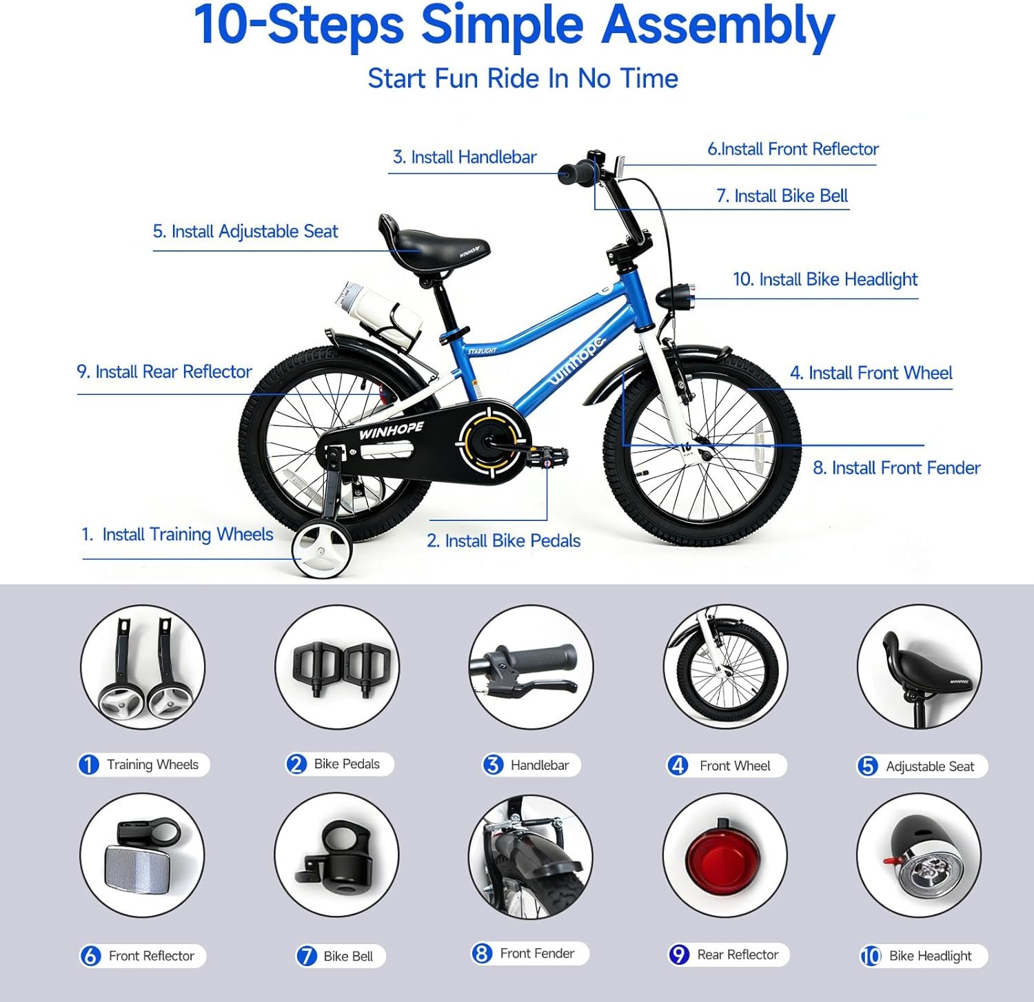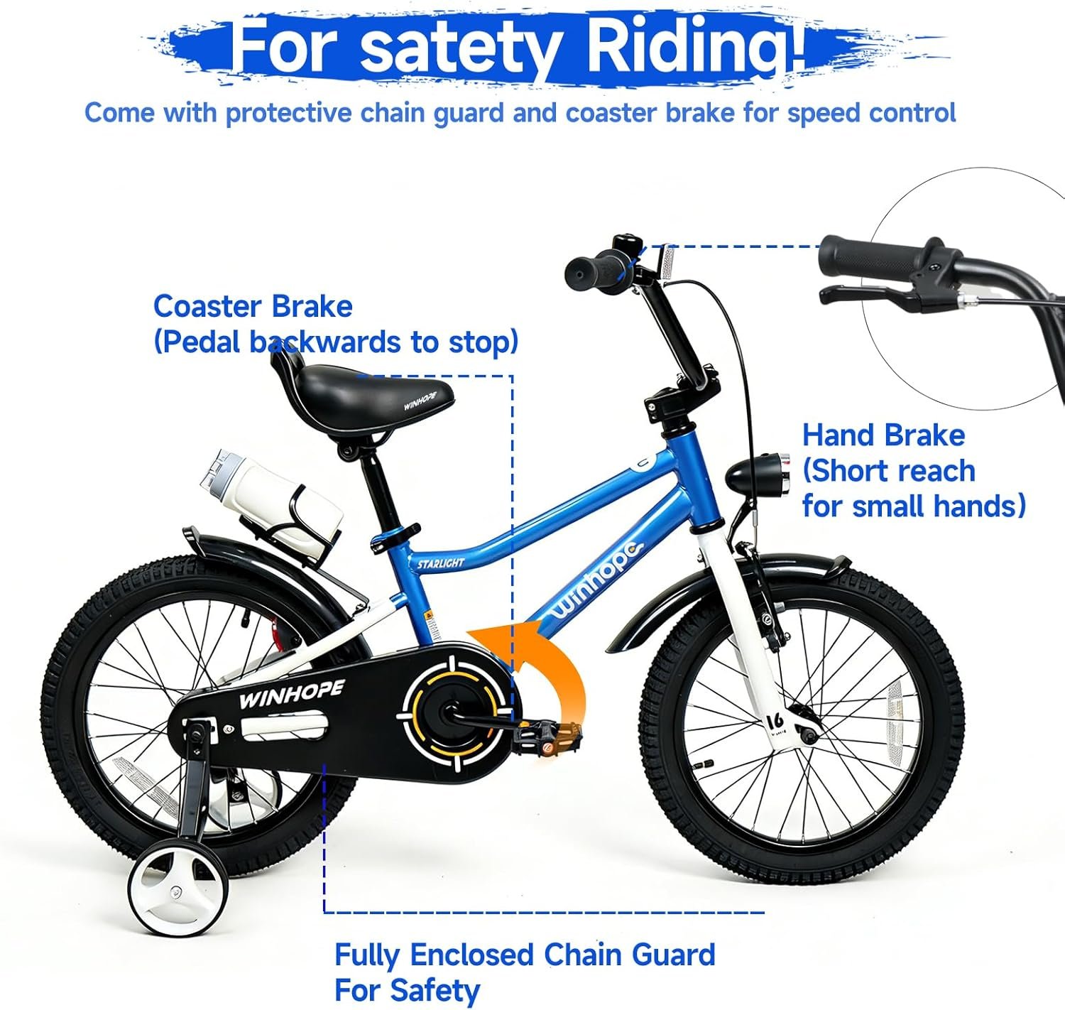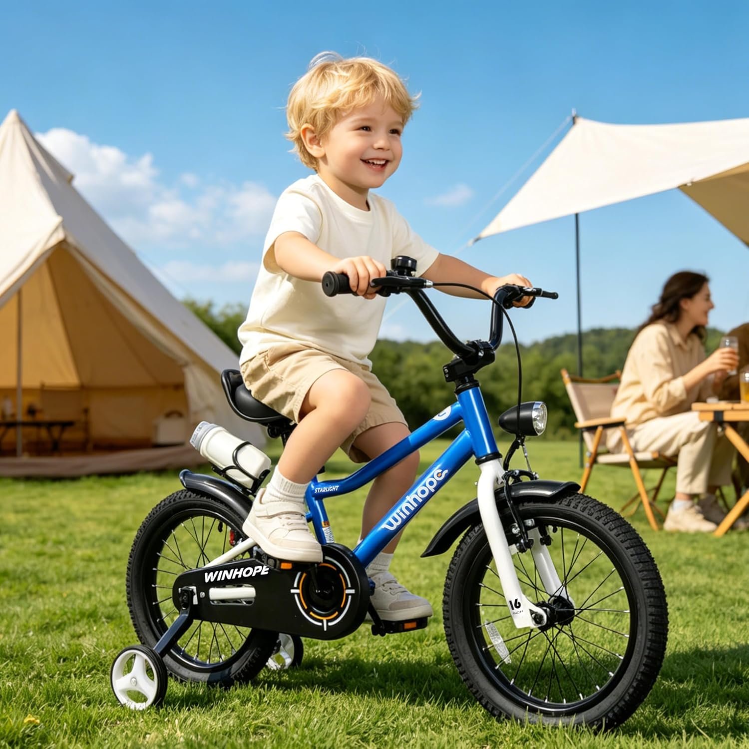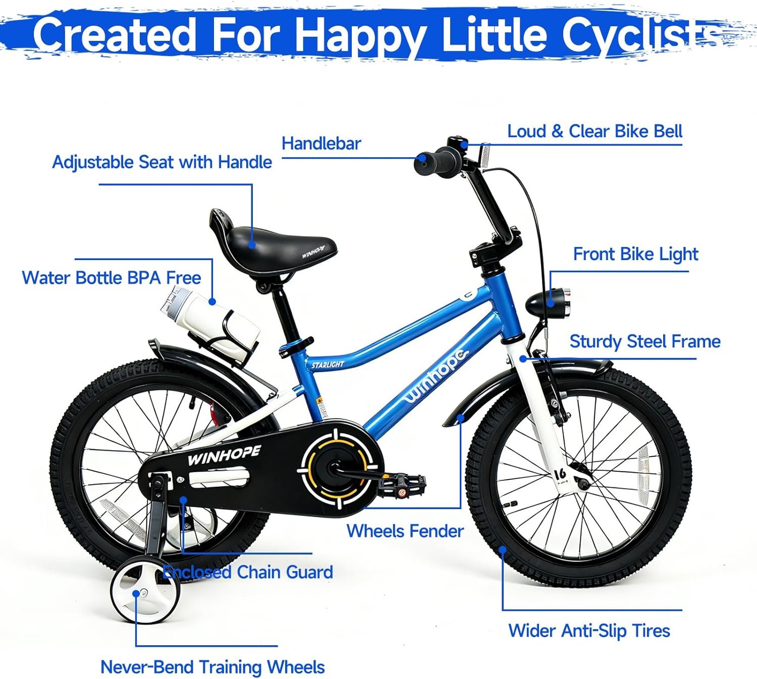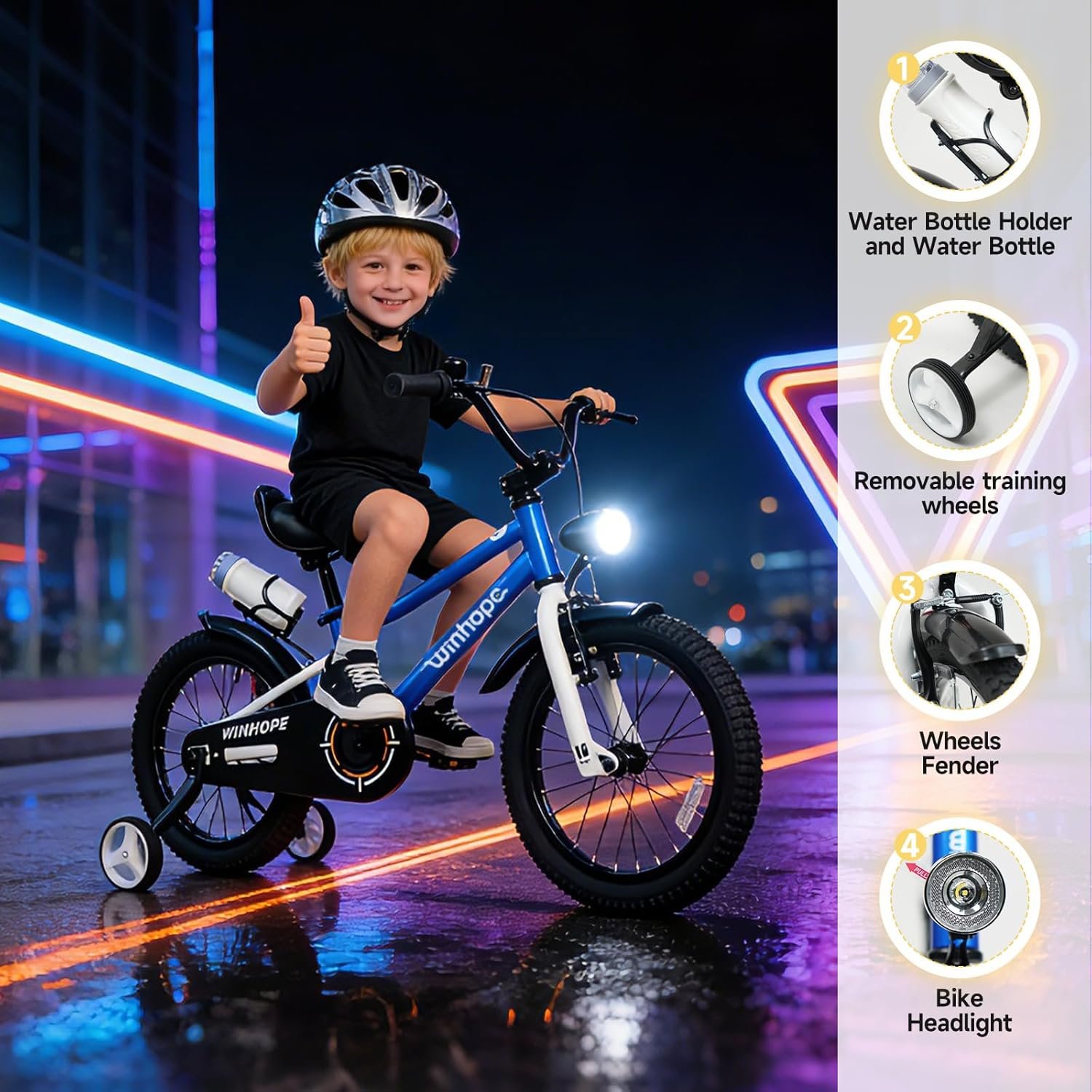 Elevate your kid’s outdoor fun with the Winhope Kids Bike—designed for ages 2–9 (12–18 inch sizes) and perfect for beginner boys and girls! 95% pre-assembled for easy setup, this kids bike is equipped with stable training wheels to help little riders master balance quickly, along with an adjustable seat that grows with your child. A dual-brake system and front headlight ensure safe visibility during outdoor riding, while full fenders block mud and splashes. The built-in water bottle holder comes with a free water bottle to keep kids hydrated on every adventure. Available in multiple stylish colors, it’s ideal for neighborhood cruising, park visits and casual outdoor play. Sturdy, kid-friendly and loaded with practical features, this Winhope bike makes an excellent birthday gift, holiday present and thoughtful surprise for your little one, creating endless happy riding memories!