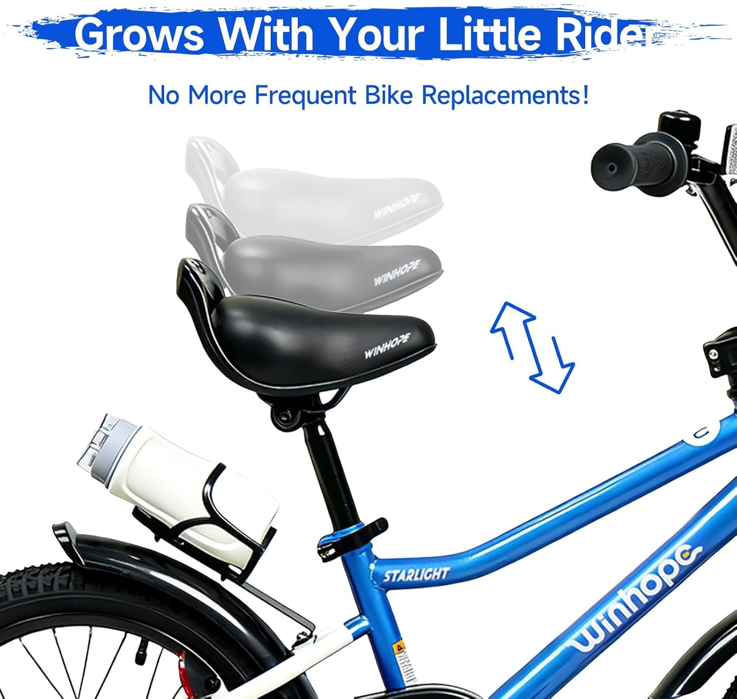 Kids Bike Size Guide: Choose the right Winhope children’s bicycle by matching your child’s stats: 12-inch (2-4Y/O, 33-41inch height, 100lbs max), 14-inch (3-5Y/O, 35-47inch, 100lbs), 16-inch (4-7Y/O, 41-53inch, 100lbs), or 18-inch (5-9Y/O, 43-59inch, 120lbs). The adjustable seat lets the bike grow with your little rider—no need to replace it as they get taller