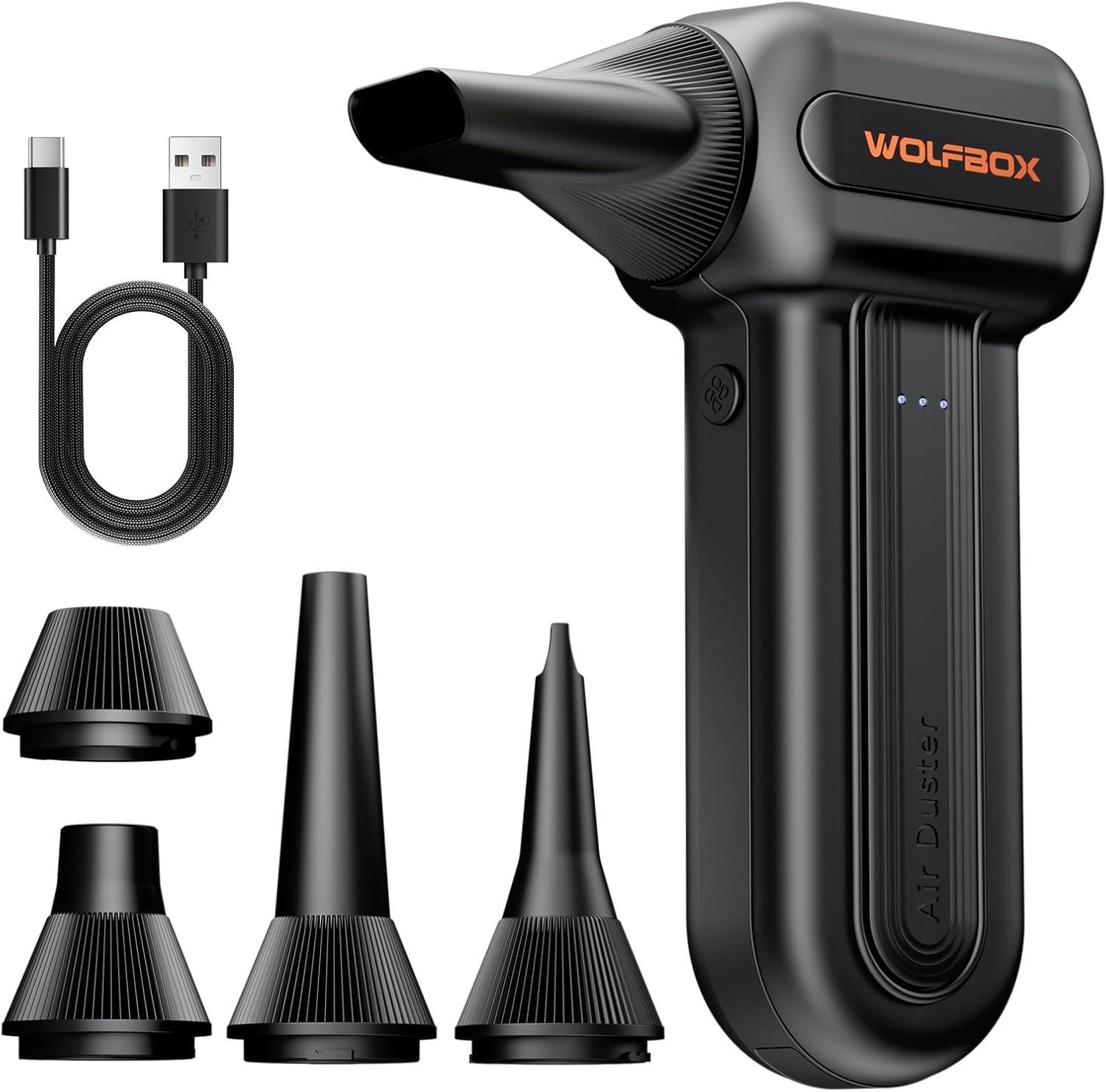 WOLFBOX MF60 Compressed Air Duster-110000RPM Super Power Electric Air Duster, 3-Speed Adjustable Rechargeable Cordless Air Blower with Fast Charging for PC Keyboard Cleaning, Car, Home, 5 Nozzle