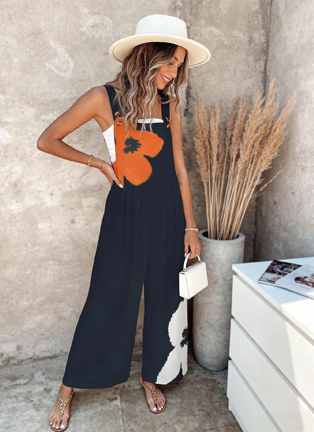 Women’s Jumpsuits 2026 Summer Floral Overalls One Piece Outfits Sleeveless Wide Leg Pants Rompers with Pockets