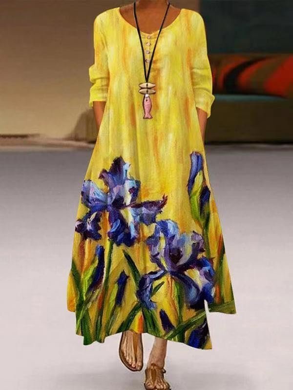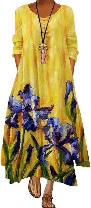 Women’s Loose Maxi Dress Round Neck 3/4 or Long Sleeves Floral, Watercolor, Ethnic & Abstract Print Casual Vacation Dress