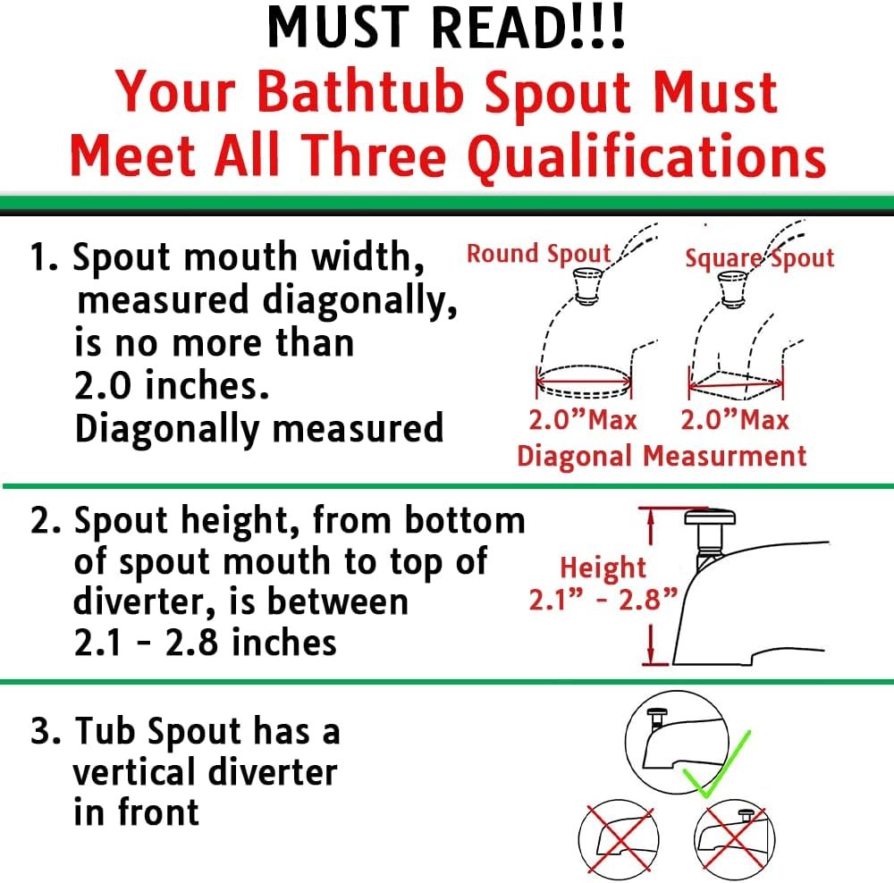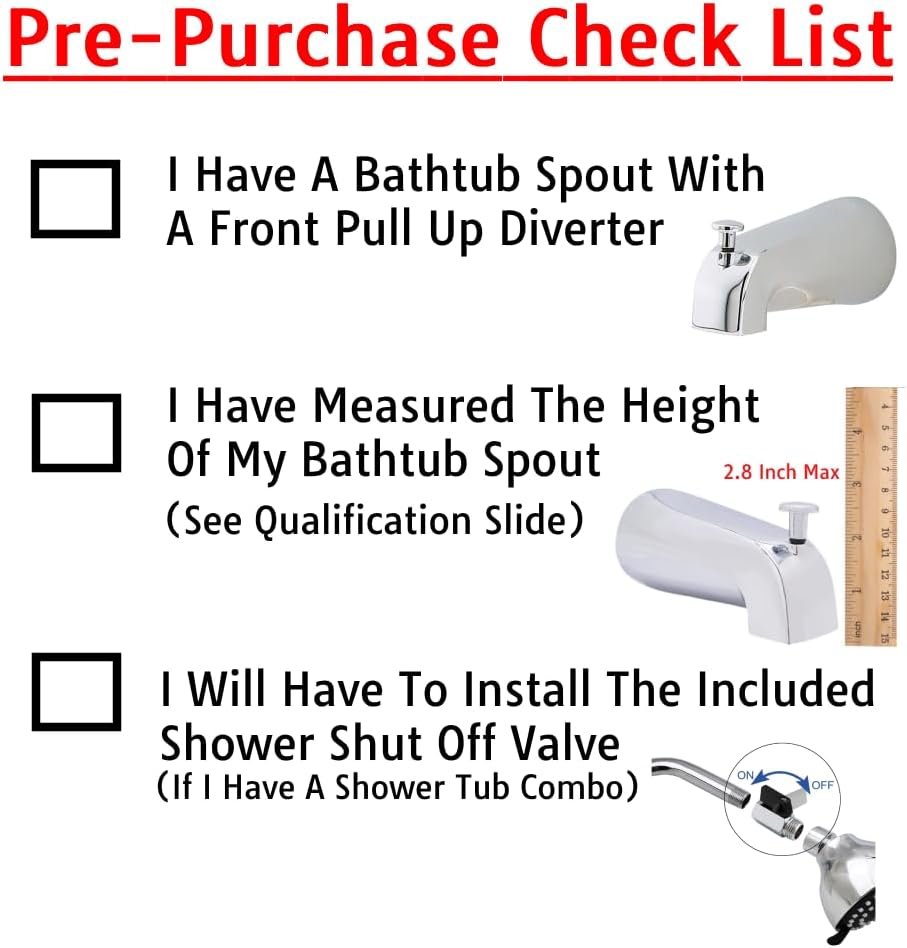 YOU MUST INSTALL THE SHOWER SHUT OFF VALVE. If you do not water will flow to your shower head. PLEASE REFERENCE THE QUALIFICATION SLIDE (SLIDE #4) before purchase. You must determine if this kit will fit your bathtub spout.