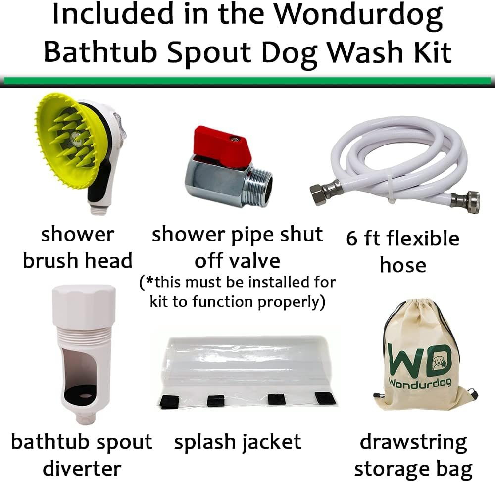Wondurdog Bathtub Spout and Garden Hose Attachment Dog Wash Kit w/Splash Shield and Rubber Scrubbing Teeth. Tub Spouts with Front Pull Up Diverter Only. Pet Grooming for Long and Short Hair.