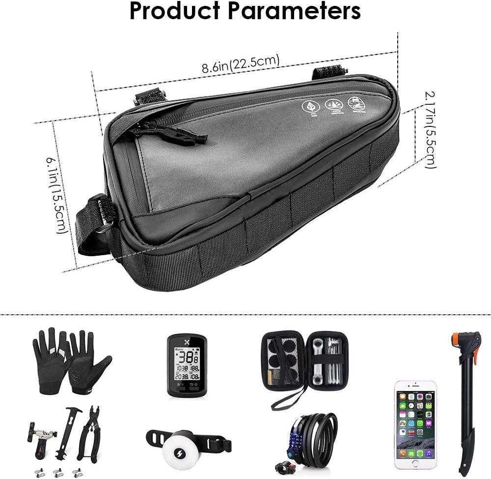 WOTOW Bike Frame Storage Bag, Water Resistant Reflective Bicycle Triangle Bag with Two Side Pockets, Strap-On Under Seat Tool Accessories Pouch for Mountain Road Bike Trip (2L)