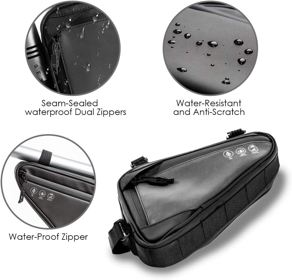 Superior Material & Water-resistant — WOTOW bicycle frame bag is made of 600D Oxford, with smooth PU film coating, not only waterproof but also durable and anti-scratch. Upgraded seam-sealed zipper can stand thousands times zip and unzip, effectively prevent rainwater from entering and protect belongings dry and safe.