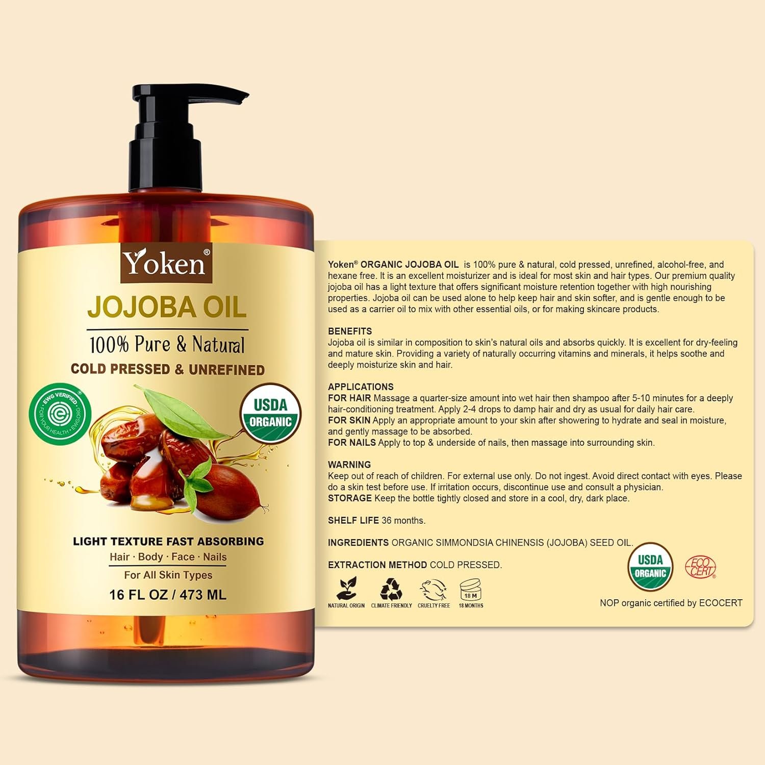 Yoken Pure Jojoba Oil Organic USDA Certified 16 fl oz, 100% Natural Jojoba Oil for Hair, Skin & Face, Cold Pressed Unrefined, Deeply Body Moisturizer Jojoba Carrier Oils for Essential oil Mixing