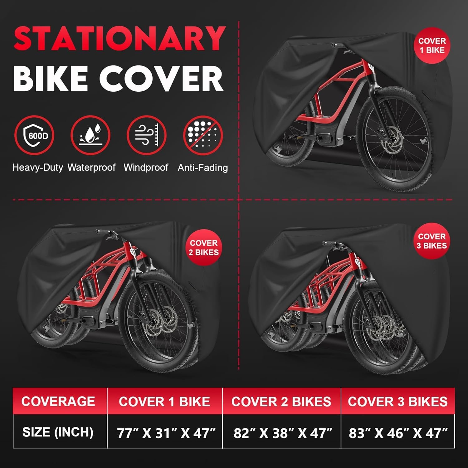 | Bike Cover for 2 Bikes Stationary | – Measures 82″ x 38″ x 47″ (L x W x H), this bicycle cover is designed to accommodate up to 2 bikes with full protection for outdoor, including: electric bike, road bike, mountain bike, hybrid bike, beach cruiser bike, scooter and more. Please arrange your bikes side by side or upside down for better coverage. (Note: please check the whole size of the 2-bike carefully!)